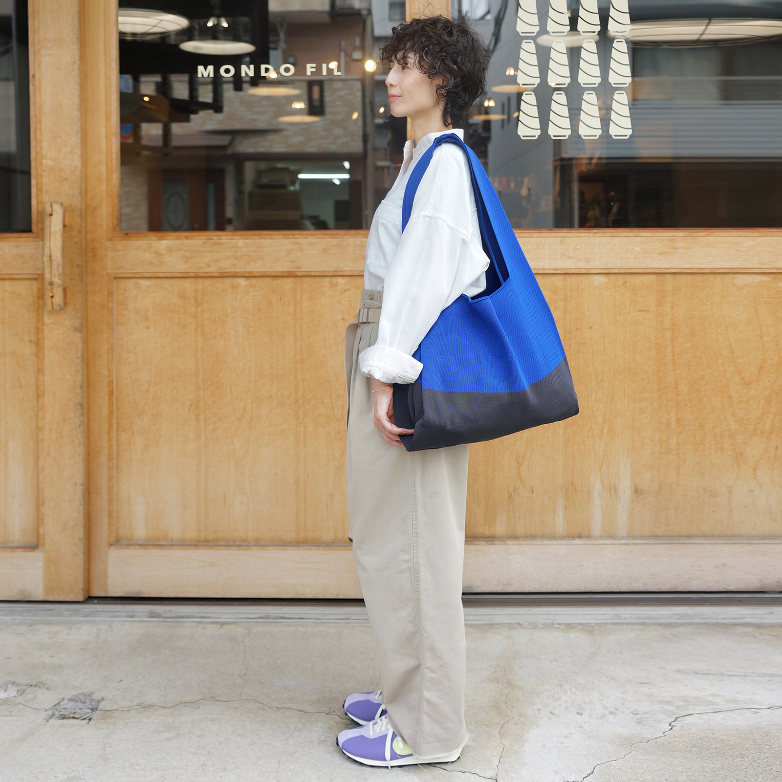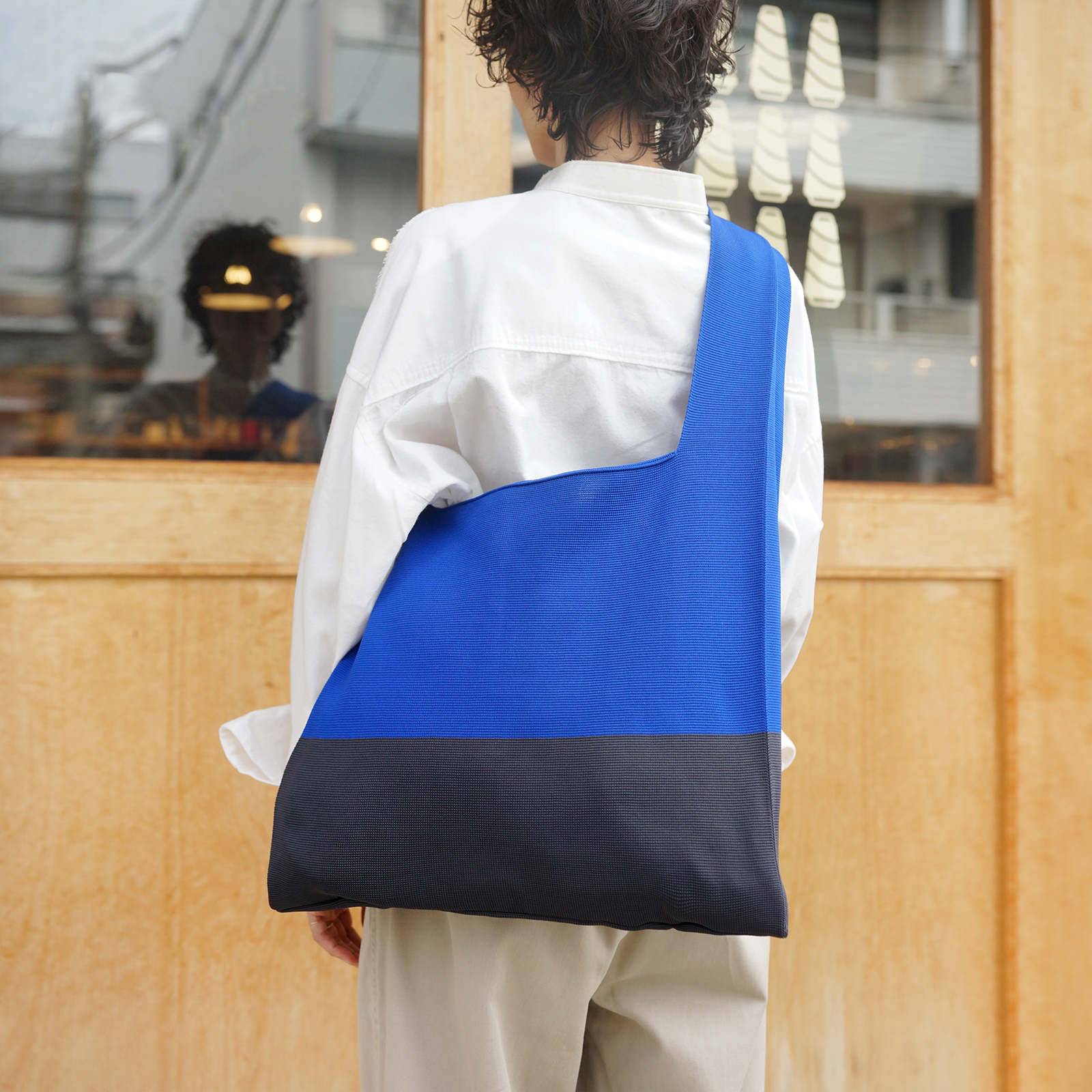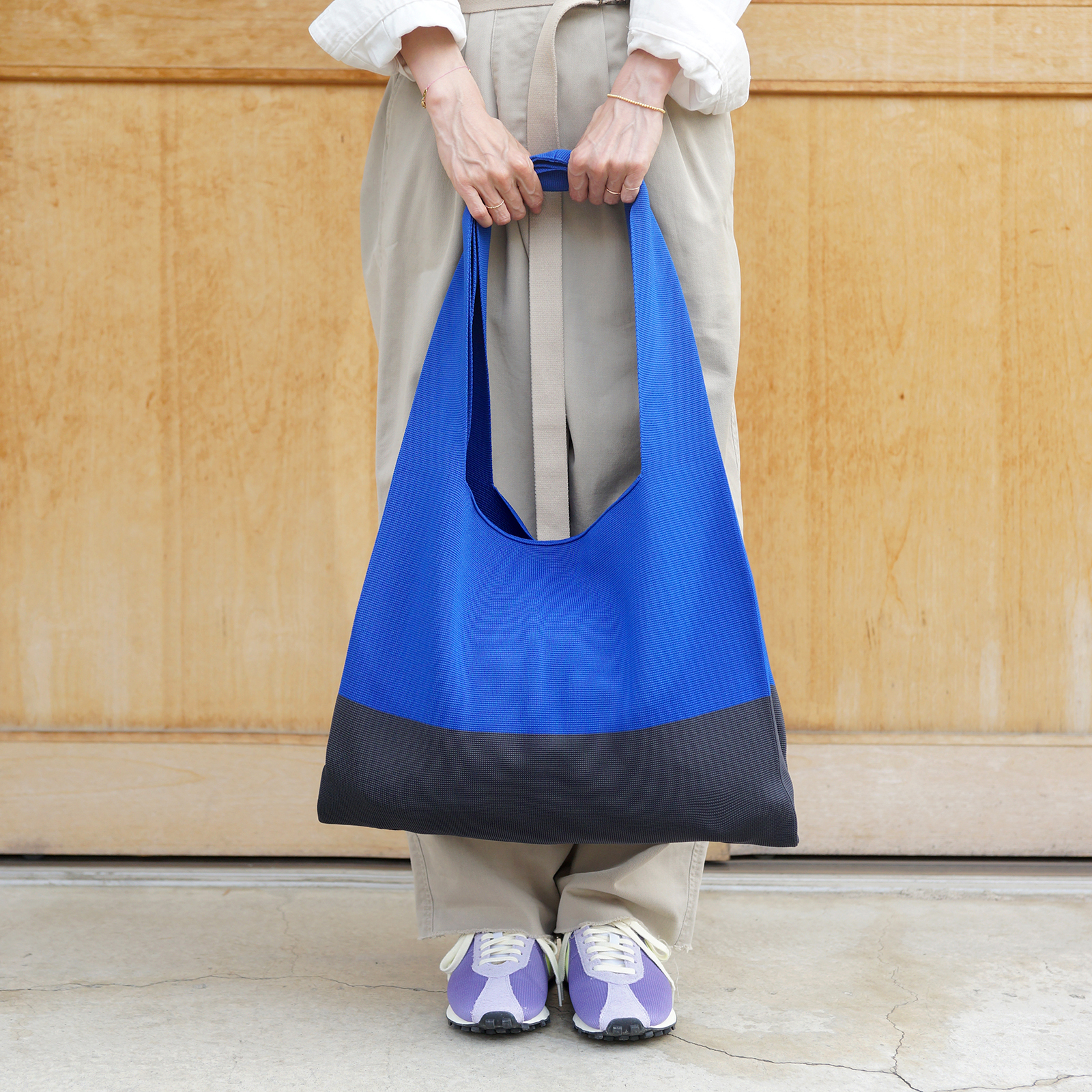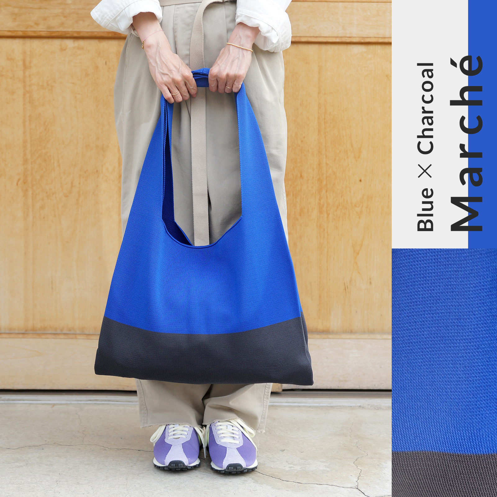 しっかりと編み込んだ伸縮性のあるストレッチ素材で、大きめながら運びやすく持ちやすい仕様で、肩にかけた時のフィット感も抜群。ラフなスタイリングの日も、2トーンの配色がオリジナリティを与えます。