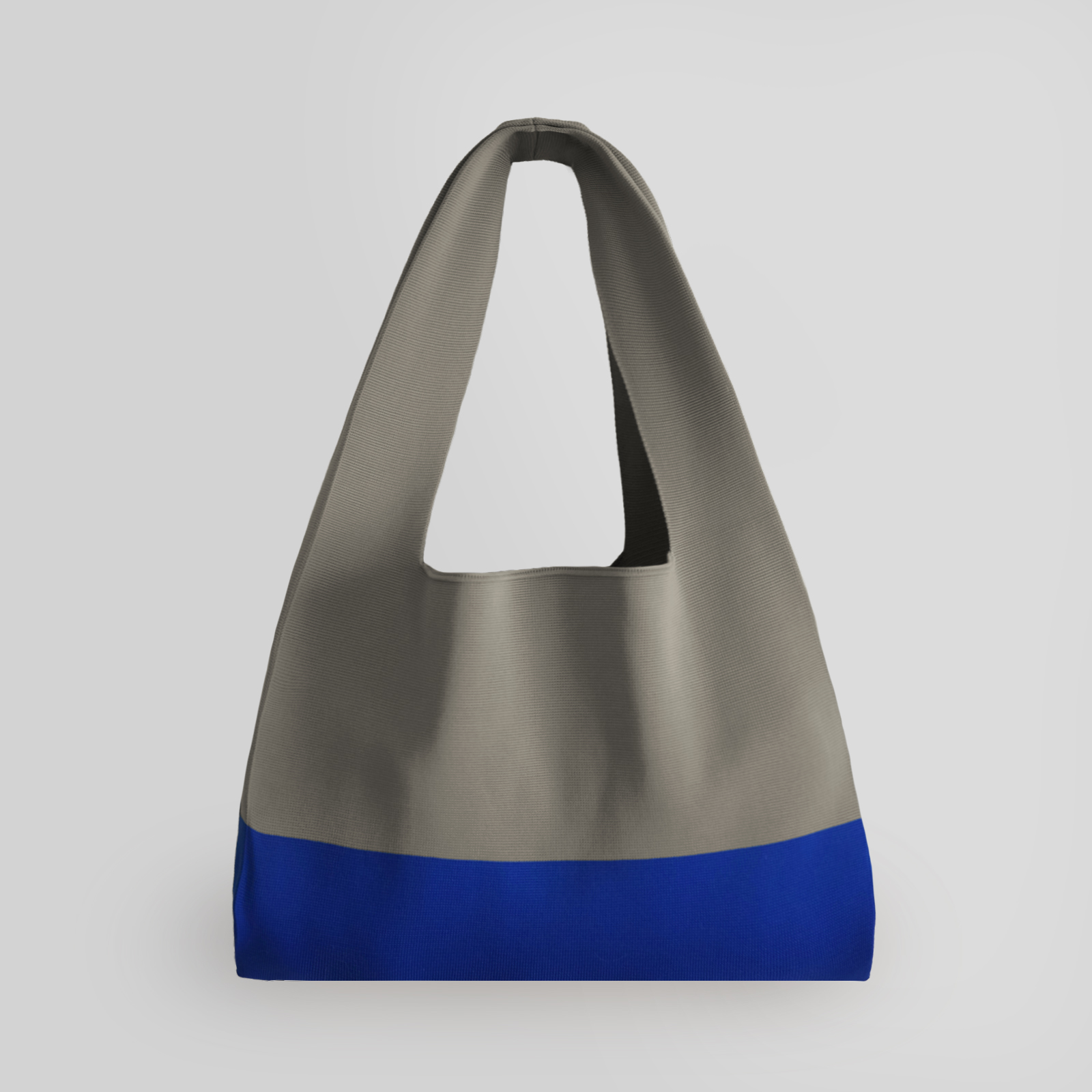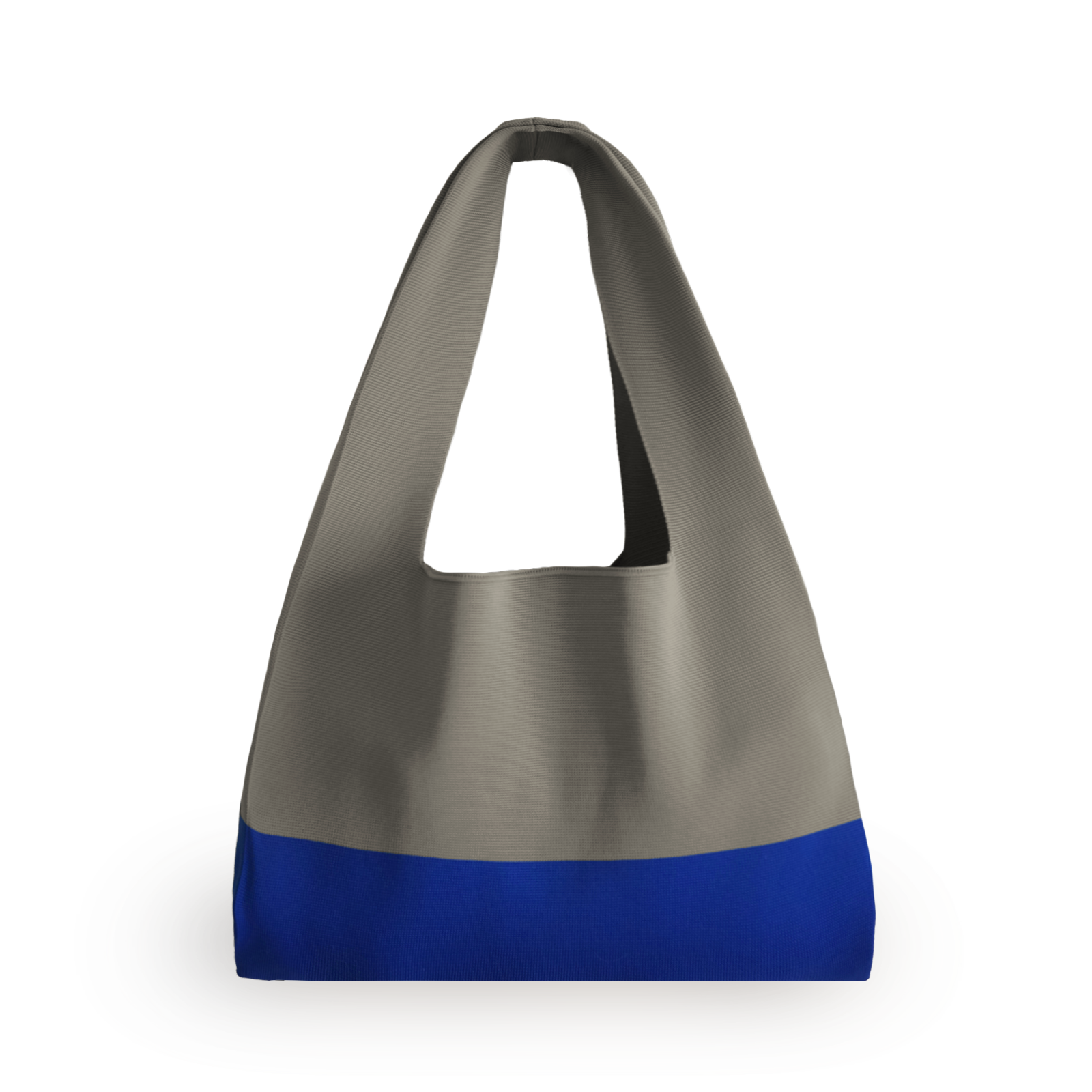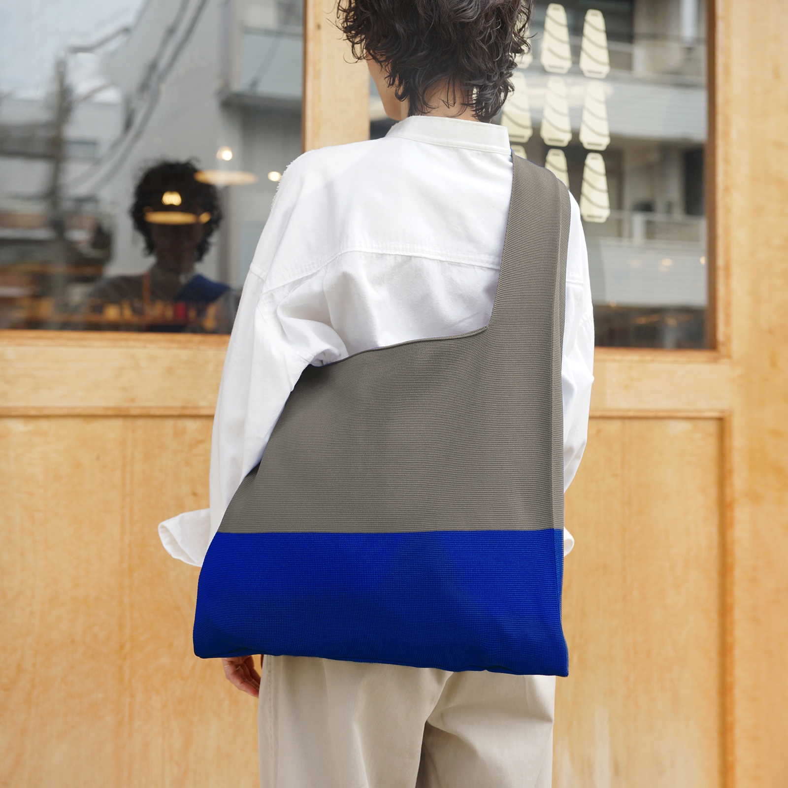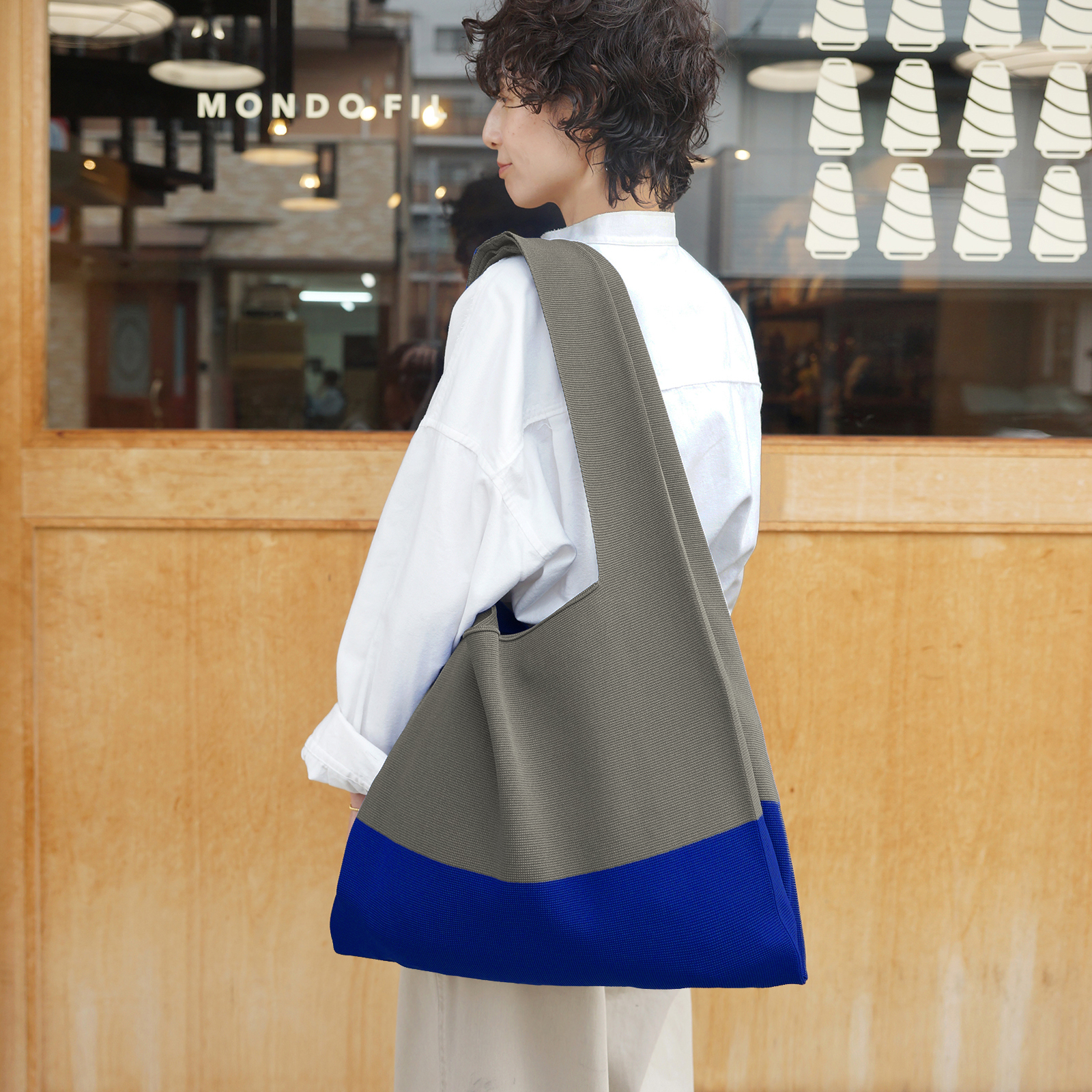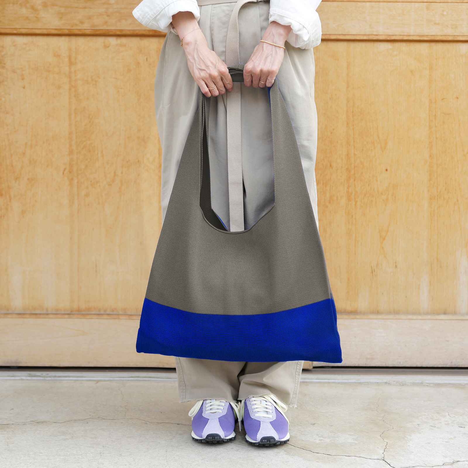 しっかりと編み込んだ伸縮性のあるストレッチ素材で、大きめながら運びやすく持ちやすい仕様で、肩にかけた時のフィット感も抜群。ラフなスタイリングの日も、2トーンの配色がオリジナリティを与えます。